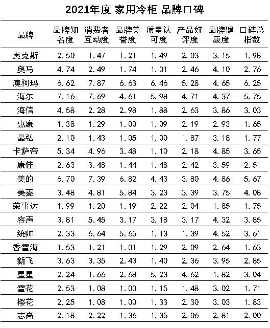 近日,中国品牌口碑指数:2021年度家用冷柜品牌口碑报告(以下简称《报告》)在京发布。